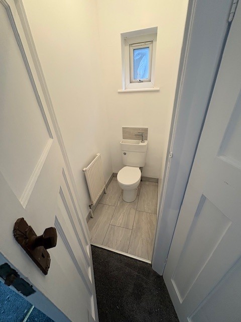 Bathroom - 1/2 tiled, two piece suite, radiator, shower over bath, Separate W/C with wash basin and radiator, laminate flooring